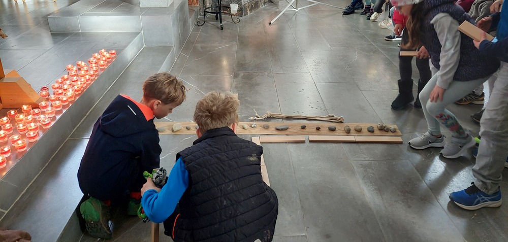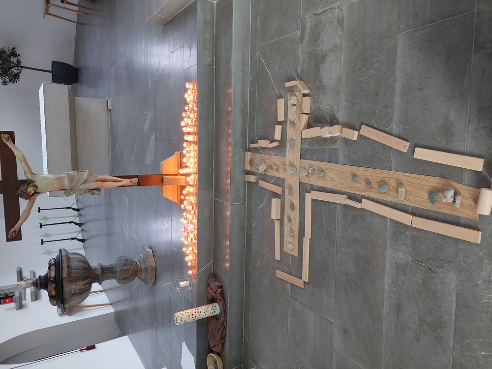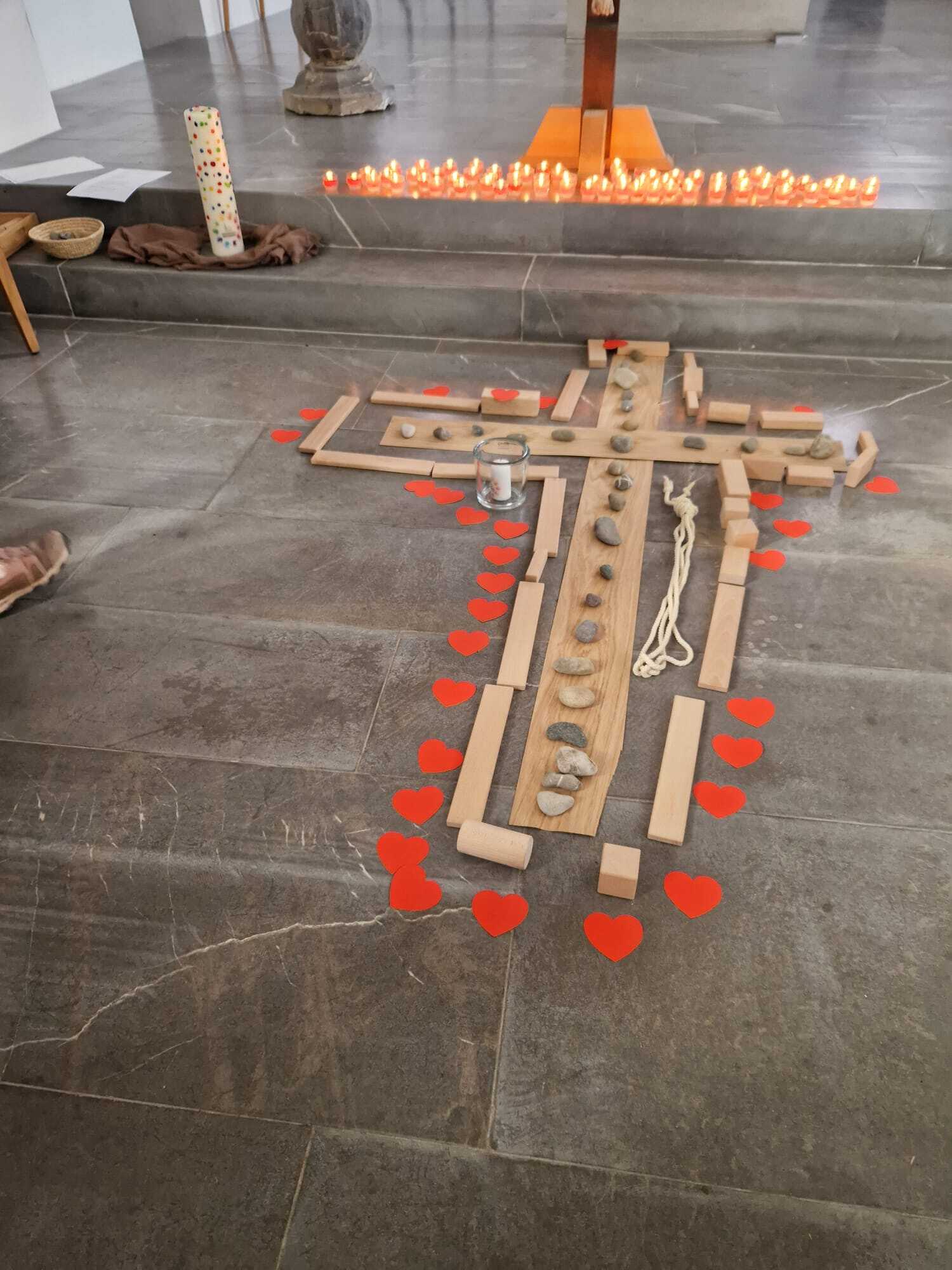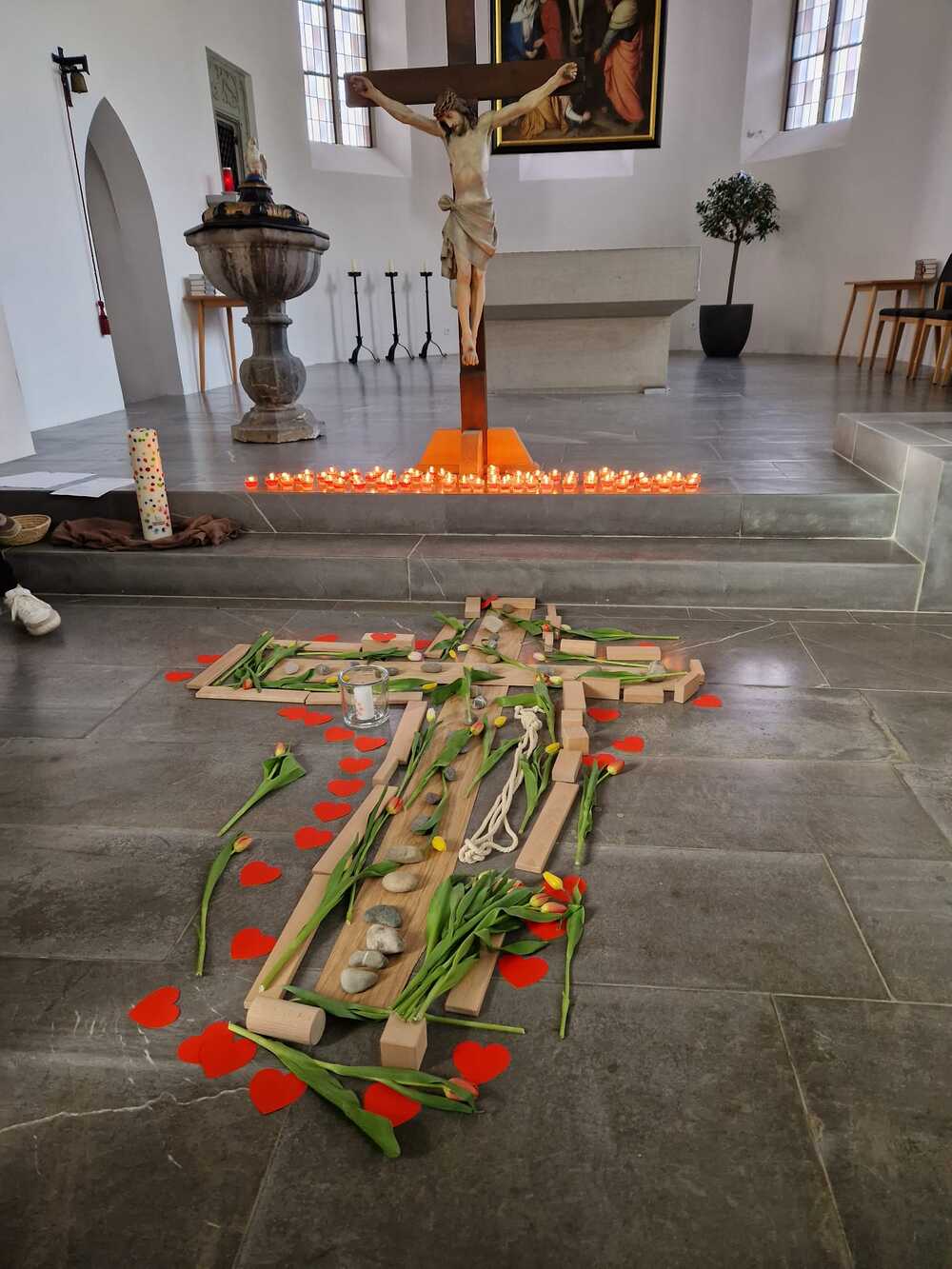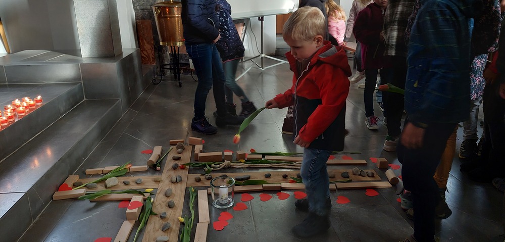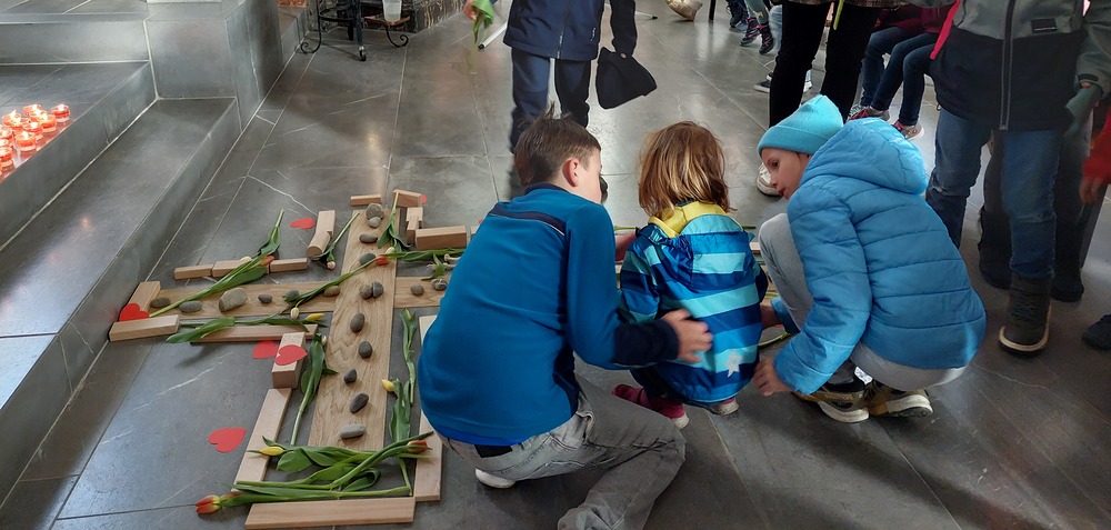 Andächtig sind wir gemeinsam mit Jesus auf seinen letzten schweren Weg gegangen, den Kreuzweg. Dabei haben wir gemeinsam ein Kreuz mit Hölzern, Seilen, Kerzen, Steinen und roten Herzen verziert. Ostern verändert die Bedeutung des Kreuzes von Hilflosigkeit, Leid, Verzweiflung, Tod hin zu einem Zeichen für neues Leben, das stärker ist als der Tod. Dies haben wir mit Tulpen versucht zu gestalten, damit wir neuen Mut, Kraft und Glauben erhalten. Mit einem gemeinsam gesungenen "Vater unser" haben wir der Verbindung zu Gott und der Kirche Ausdruck verliehen.